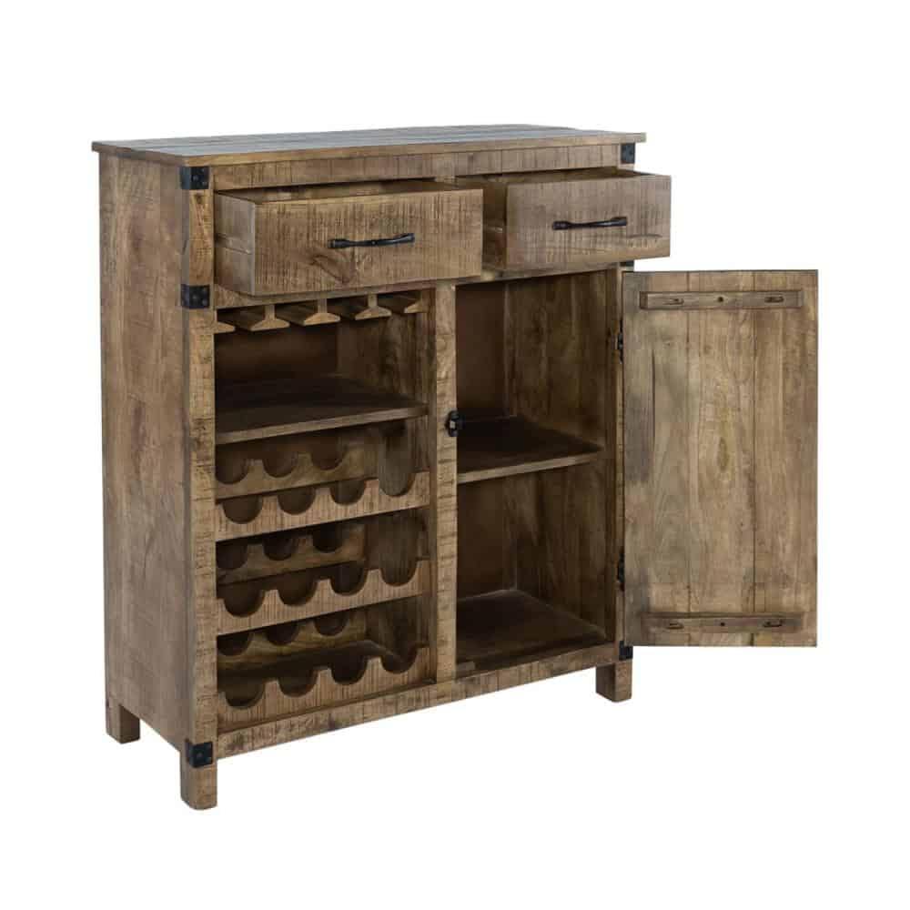 By Liberty Furniture. Emerson accent wine bar is just the right scale for smaller space with lots of function. Crafted of solid mango finished in a Weathered Honey. Features one door with fixed shelf behind with an iron door latch, two drawers, 12 bottle wine rack, stemware storage and arrow shaped door hinges. The design will work with all decor from farmhouse to vintage. Special order.