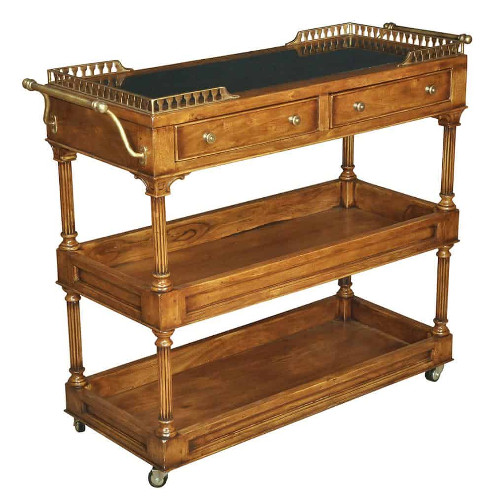 By Sarreid. A practical black granite serves as a serving area on our serving cart. Brass railing, small casters and brass hardware. Special Order.