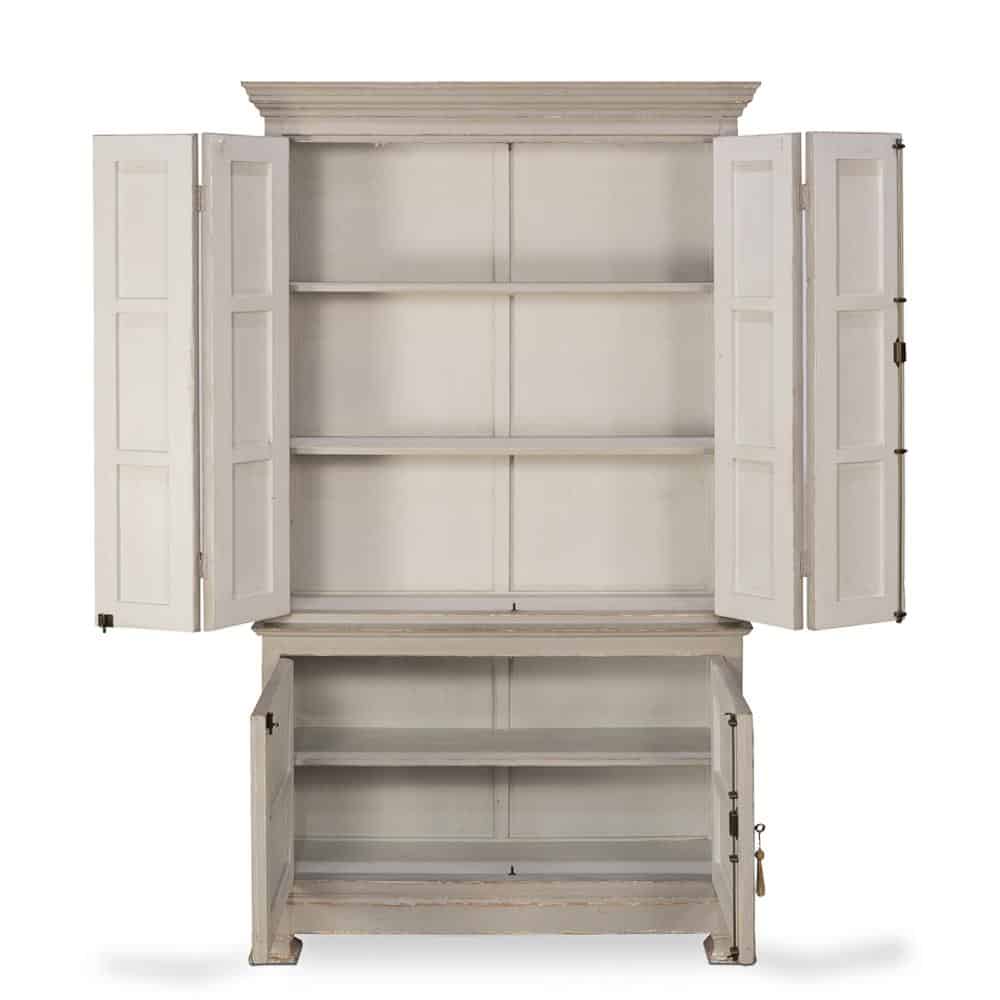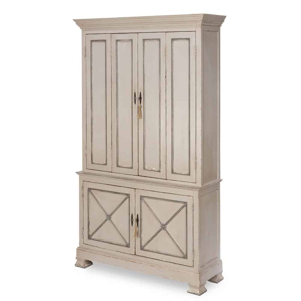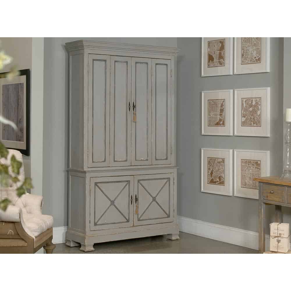 By Sarreid. Our Directoire Cabinet will impress you with its custom painted finish. We used gray and blue gray to give you a quite classic French look. You will find shelving behind the two doors. Two keys are included. Special Order.