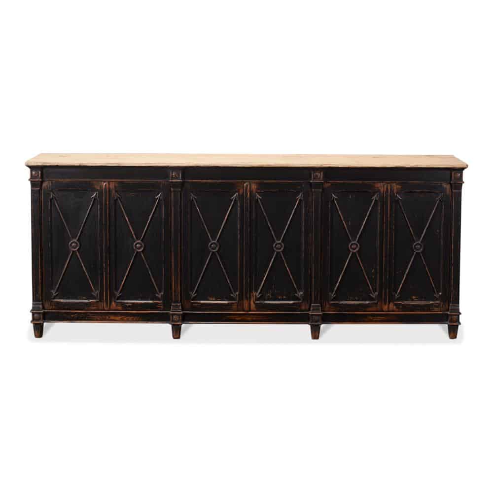 By Sarreid. Painted pine cabinet with interesting detail on its six doors. An efficient size for the kitchen, its interior shelves are removable. Special Order.