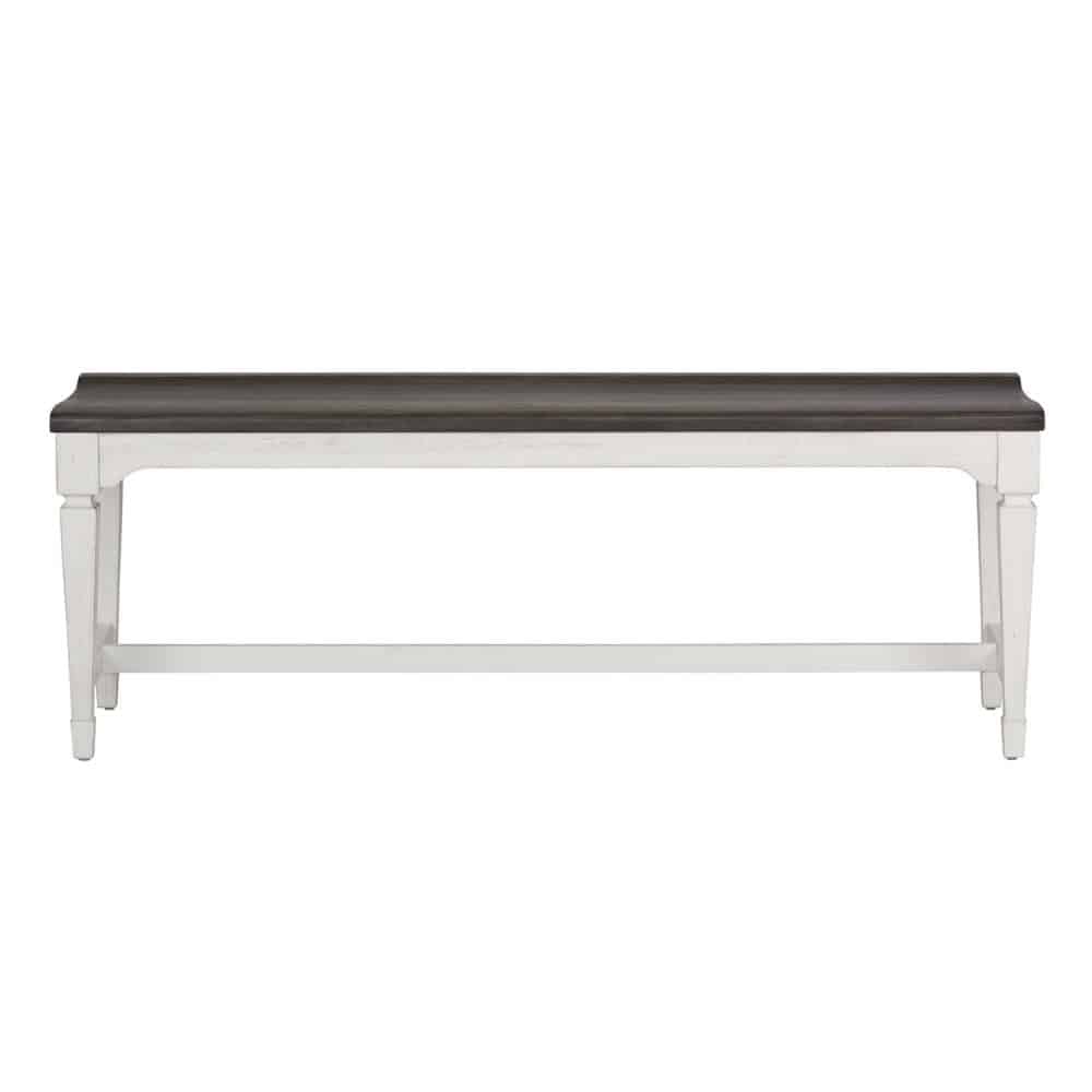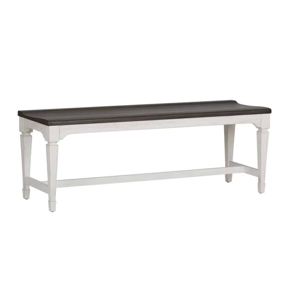 By Liberty Furniture. Sit in comfort and style with the Allyson Park wood seat bench. Crafted of rubberwood and poplar solids, this piece features a wire brushed white finish with a charcoal seat, nylon chair glides to protect your flooring, curved wooden seat for added comfort, and is anchored by square tapered legs. This bench is perfect for creating a classic look while maintaining a casual feel. Special Order.