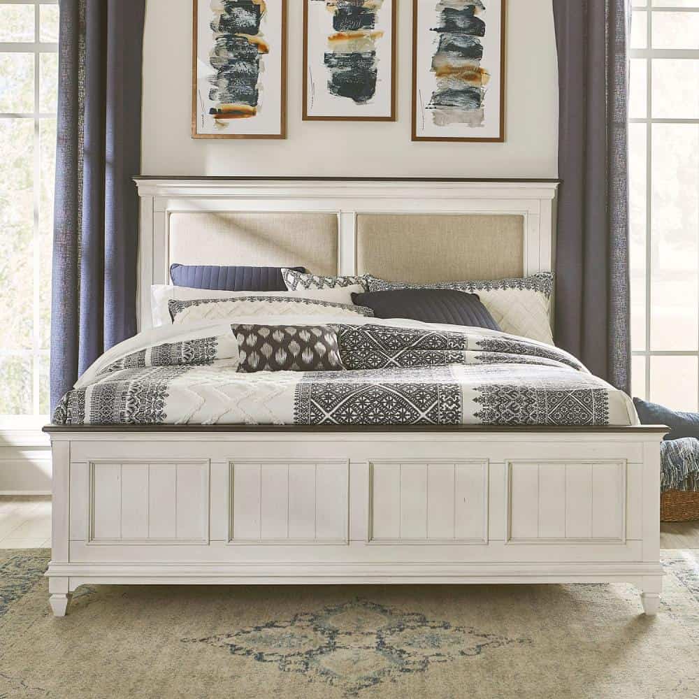 By Liberty Furniture. Create a classic look with a casual feel using the Allyson Park upholstered bed. The two-toned wire brushed white finish with charcoal tops creates a cottage style that works anywhere from the beach to the mountains. Crafted with pine solids and veneers with cathedral white oak tops, this piece features two panels upholstered in a beautiful grey linen, center slat support system, bolt on rails, bead molding and a charcoal gray cap rail. Available in Queen, King and California King. Special Order.