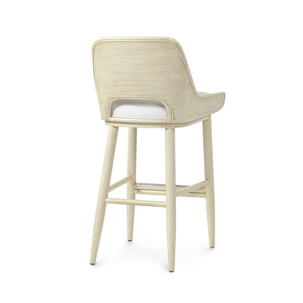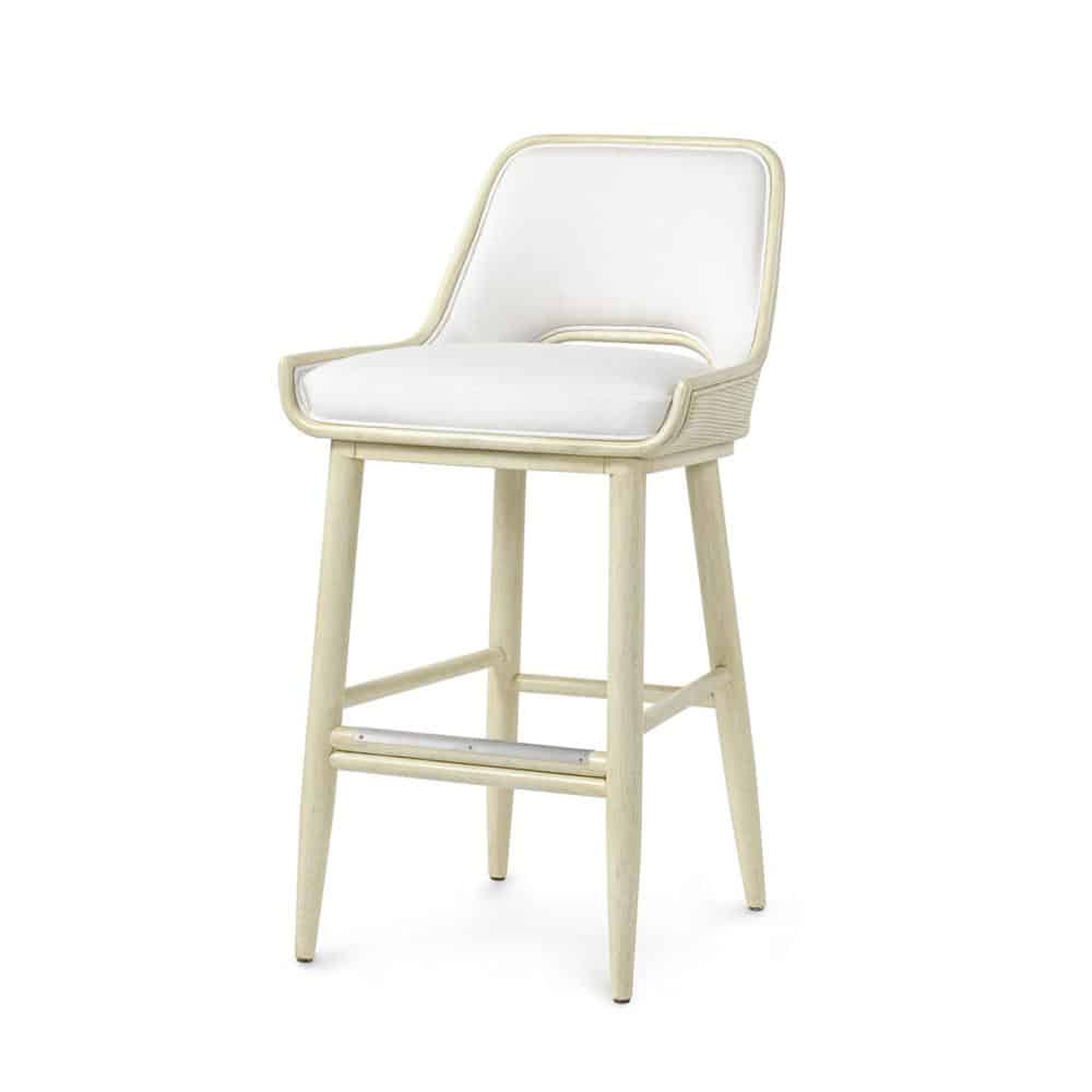 By Palecek. The Alvaro Barstool is made of a Rattan frame with hand-distressed hardwood legs featuring core rattan placed in a horizontal design around the outside back accented with a pewter finished metal footrest on the front stretcher. Stool comes with a fixed upholstered seat and fully upholstered inside back. Available in all PALECEK finishes and your choice of fabric. Made to Order.