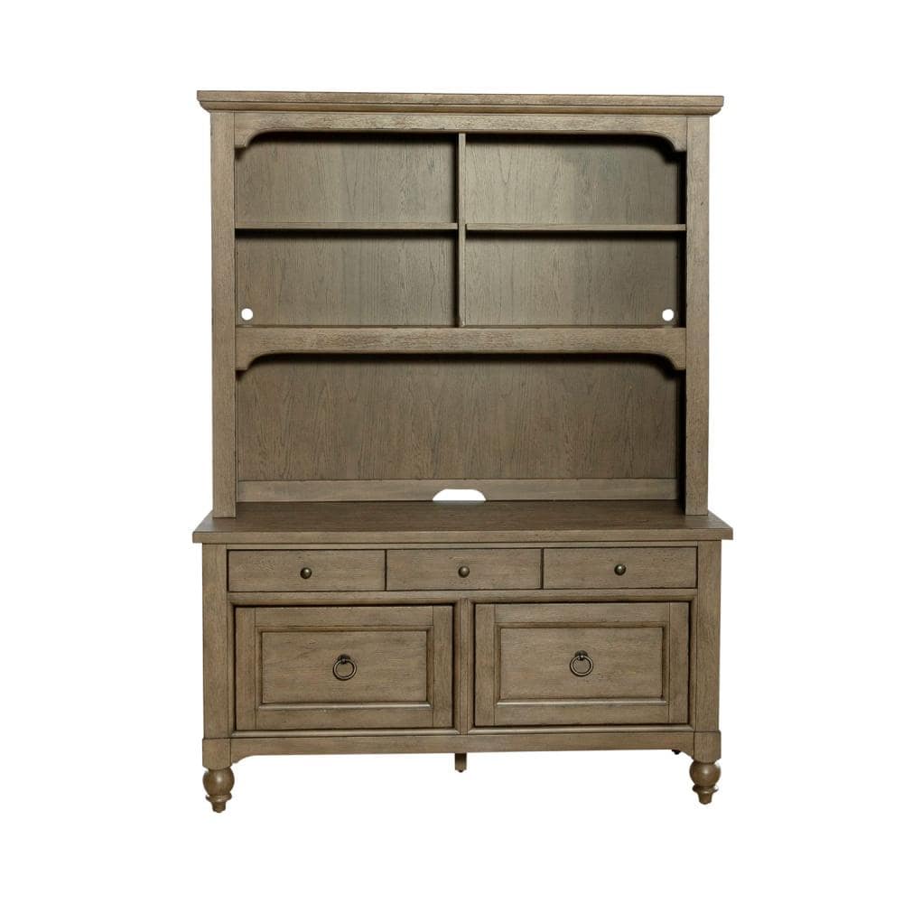 By Liberty Furniture. Be distinctively different with the Americana Farmhouse credenza and hutch set. Crafted of poplar solids with white oak veneers, this set features a wire brushed dusty taupe finish with worm hole distressing and is accented with antique brass drop ring and knob hardware. The credenza has a total of five full extension drawers including three top storage drawers and two wood framed file storage drawers. The hutch features wire management provisions and includes to fixed shelves and two adjustable shelves for display and storage. Americana Farmhouse evokes a style unconstrained and intended to be personal with an authentic craftsman’s flair and artistry. Special Order.