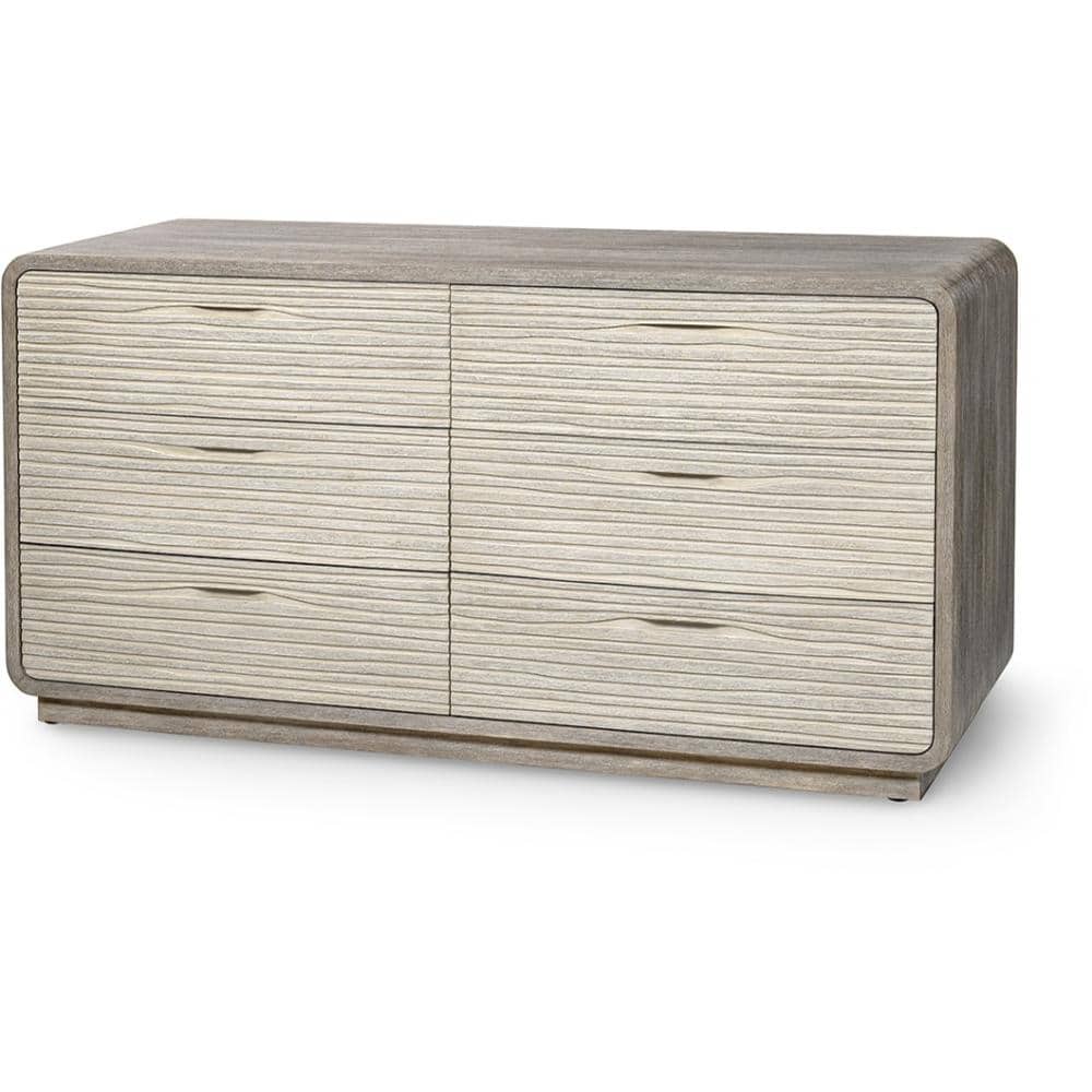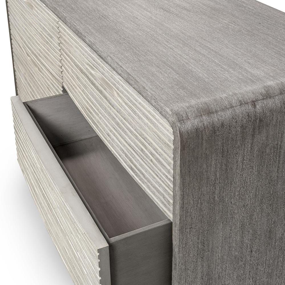 By Palecek. Cerused wood frame, shelf, and base in a grey finish with six soft-closed drawers both with textured hardwood drawer fronts in a light grey finish. Special Order.