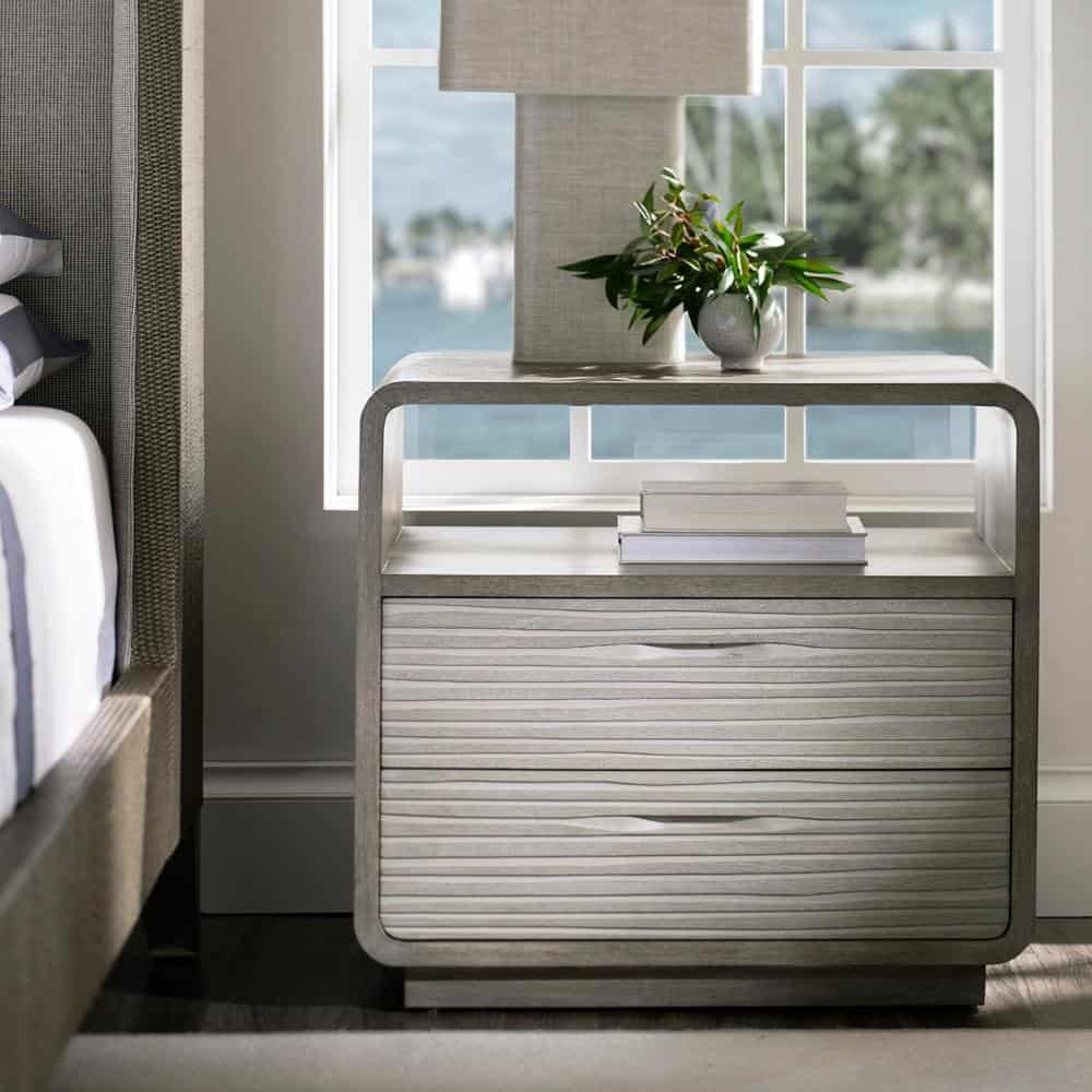 By Palecek. Cerused wood frame, shelf, and base in a grey finish with two soft-closed drawers both with textured hardwood drawer fronts in a light grey finish. Special Order.