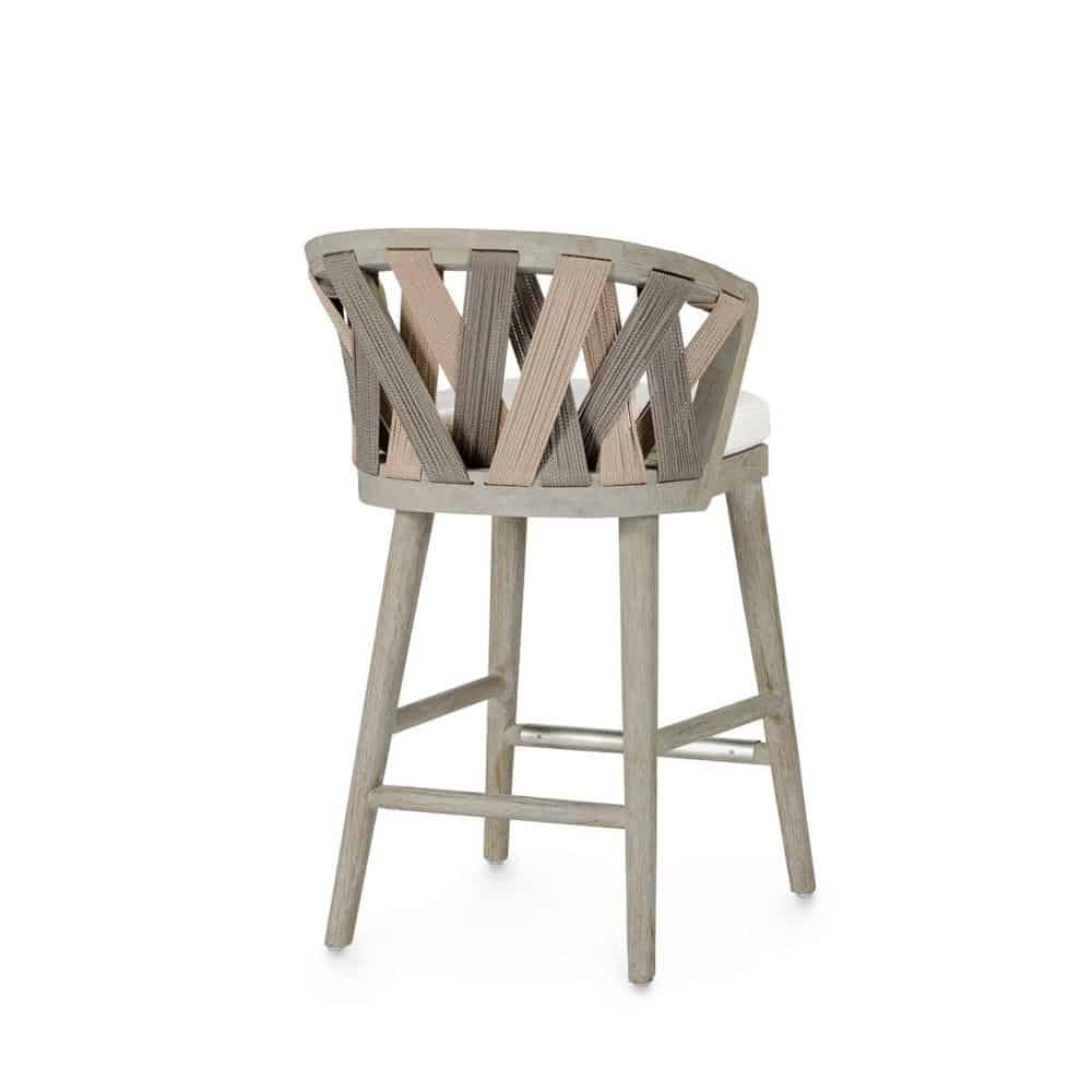 By Palecek. Teak wood frame and legs in a weathered grey finish with wide bands of woven synthetic rope in a taupe and grey finish with maximum UV protection. Barstool comes with an aluminum footrest on the front stretcher and a loose seat cushion. Coordinates with the Boca outdoor collection. Available in your choice of fabric. Special Order.