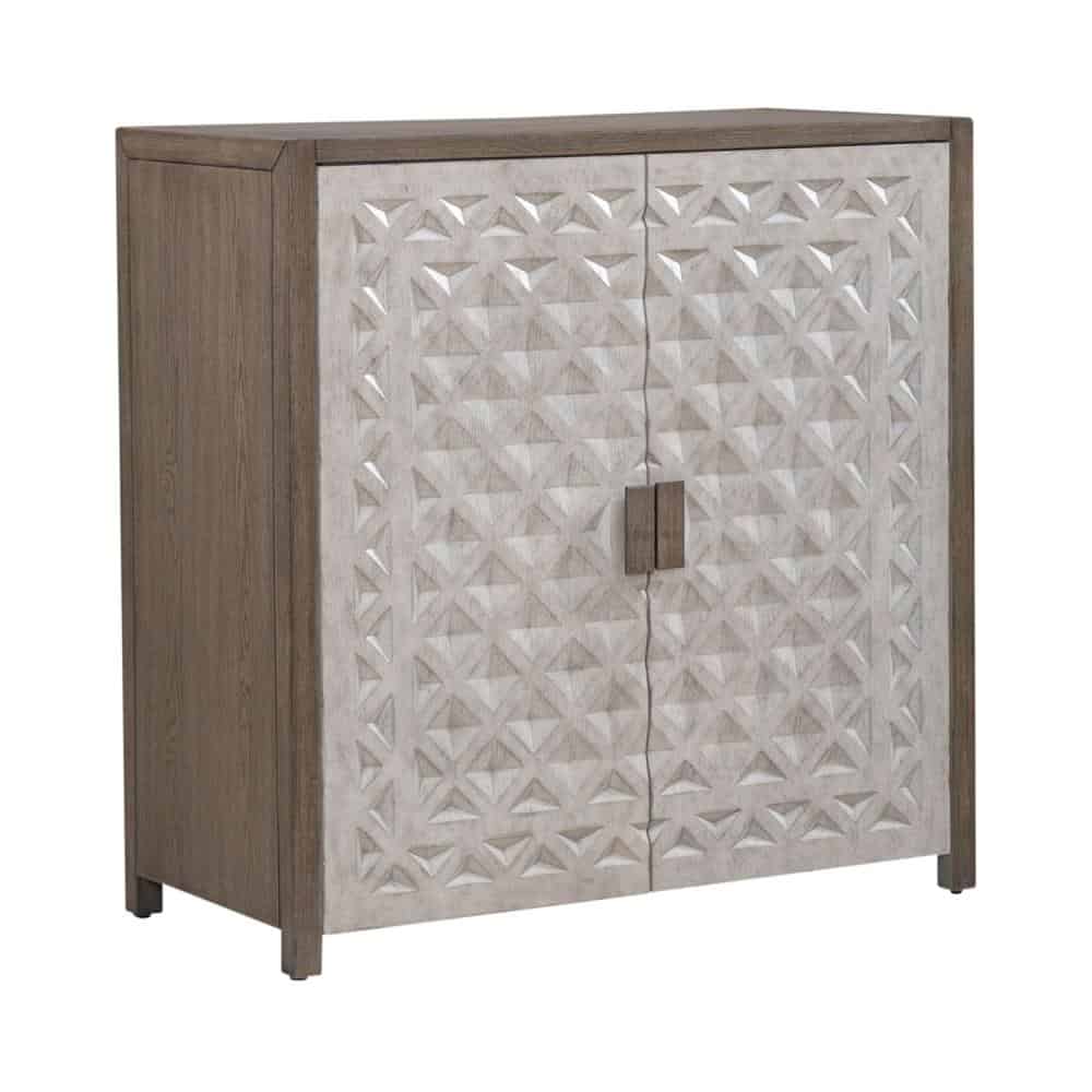 By Liberty Furniture. Creativity starts here. The Chatfield accent console inspires compliments no matter where it sits. Crafted with excellence using rubberwood solids and white oak veneers, this accent console features an Antique White and Tobacco finish. Texture will be added to your décor with the unique door pattern on the Chatfield accent console that is accented with custom wood knob hardware. The doors are supported with European soft close hinges and open to reveal two adjustable shelves. The Chatfield accent console is sure to be a statement piece in your home. Special Order.