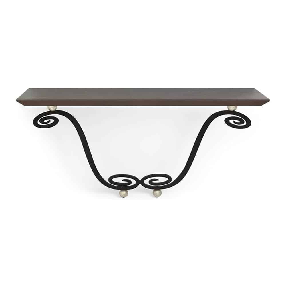 By Christopher Guy. Striking forged-iron console with hand-carved scroll accents and a mahogany veneer top. Wall secured. Available in your choice of finishes. Shown in Tabac, Black Shadow, and Italian Silver Leaf. Special Order.