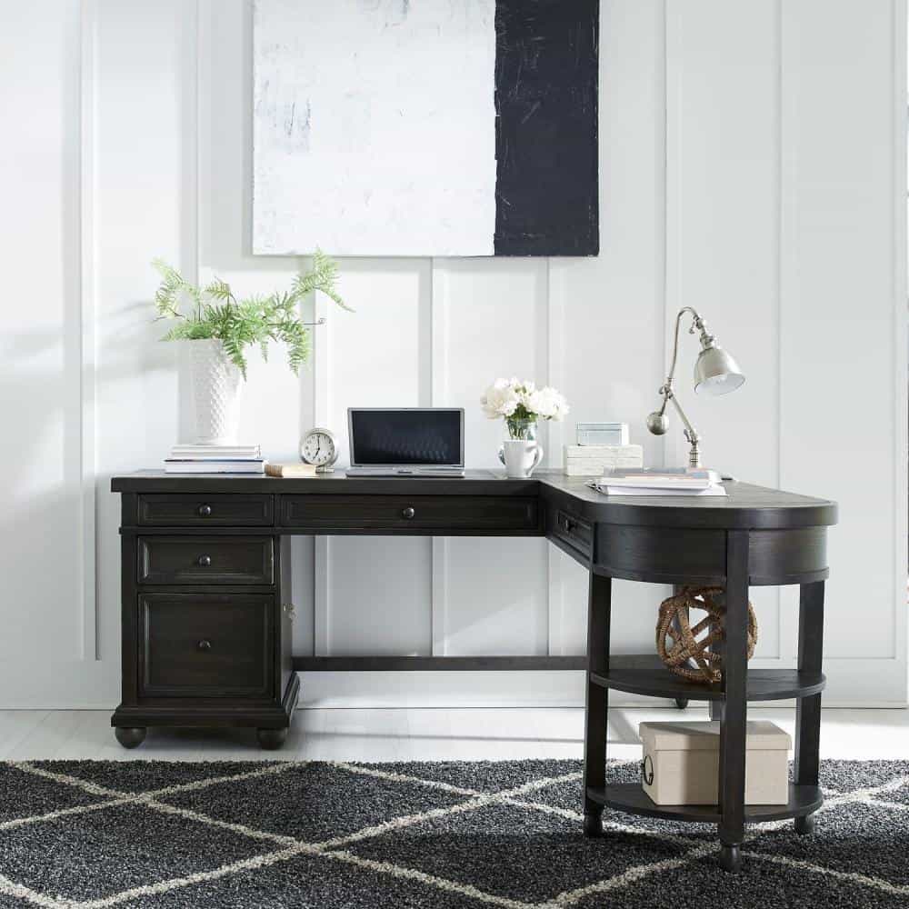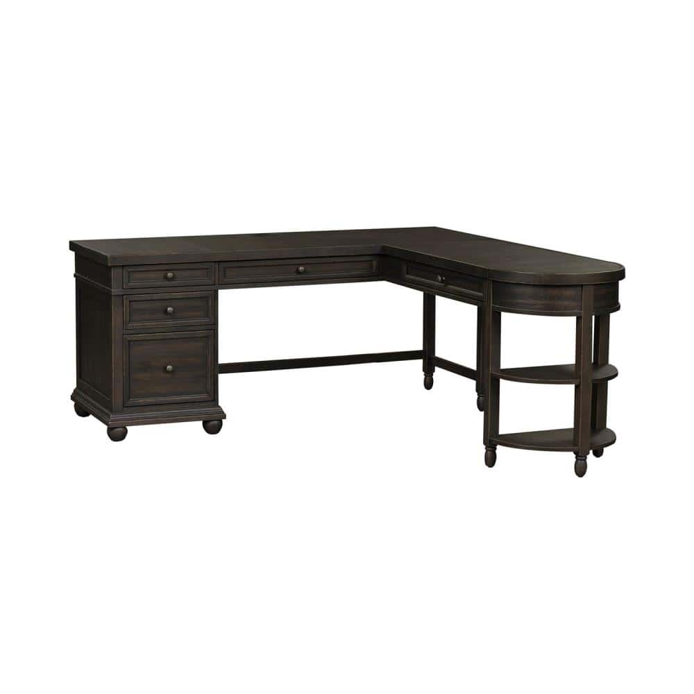 By Liberty Furniture. Work from home in comfort and style with the Harvest Home L shaped desk set. Crafted of rubberwood solids with knotty white oak veneers, this desk features a chalkboard finish with saw cut hewing, full extension drawer glides for easy access to storage, five interior storage drawers, including two flip down keyboard drawers and a locking file drawer, bottom case dust proofing to protect contents, and additional storage with the shelving at the end of the curved shape return. This set effortlessly creates a casual look with a classic feel. With today’s modern technology in mind, this set features a built-in charging station with two plugs and two USB ports, making multi device charging a breeze. Special Order.