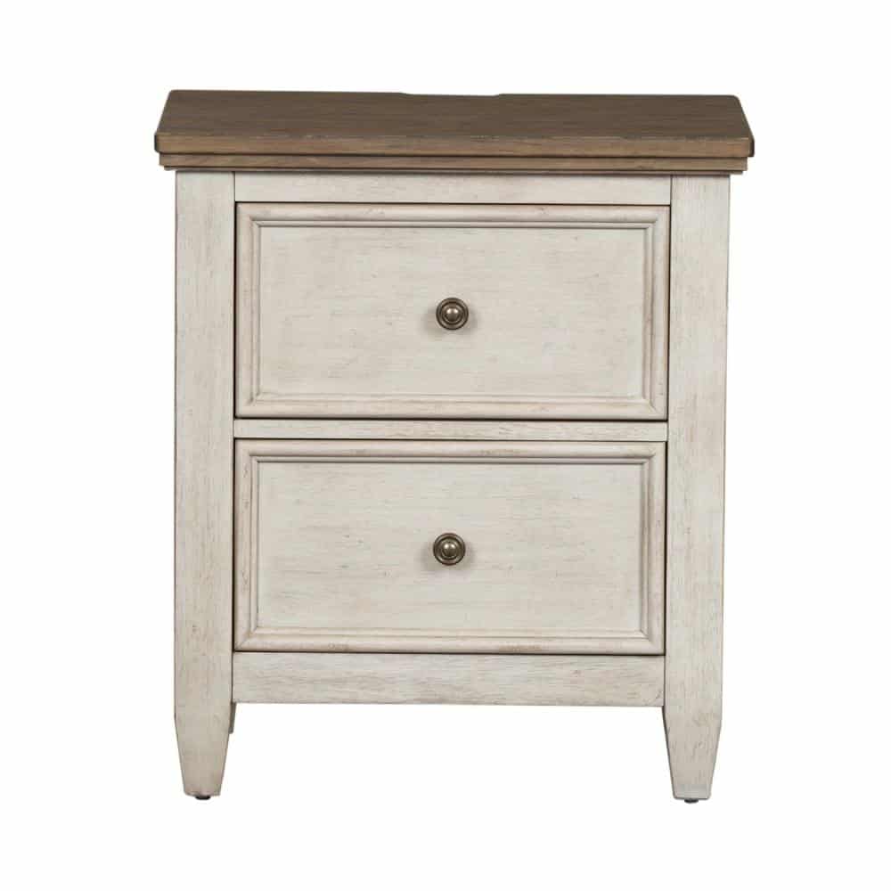By Liberty Furniture. The Heartland night stand is sure to make a statement in any home, as its heavily distressed finish is adaptable to any space. Crafted with rubberwood solids and cathedral white oak and birch veneers, this two-toned piece features a felt line drawer, cedar lined bottom drawer, with wood framed drawer fronts, accented by antiqued brass knob hardware. With today’s electronics in mind, this piece includes a 2-port charging station for user convenience, making multi device charging a breeze. Maximize storage with the convenient bottom shelf, perfect for storing your everyday items. Special Order.