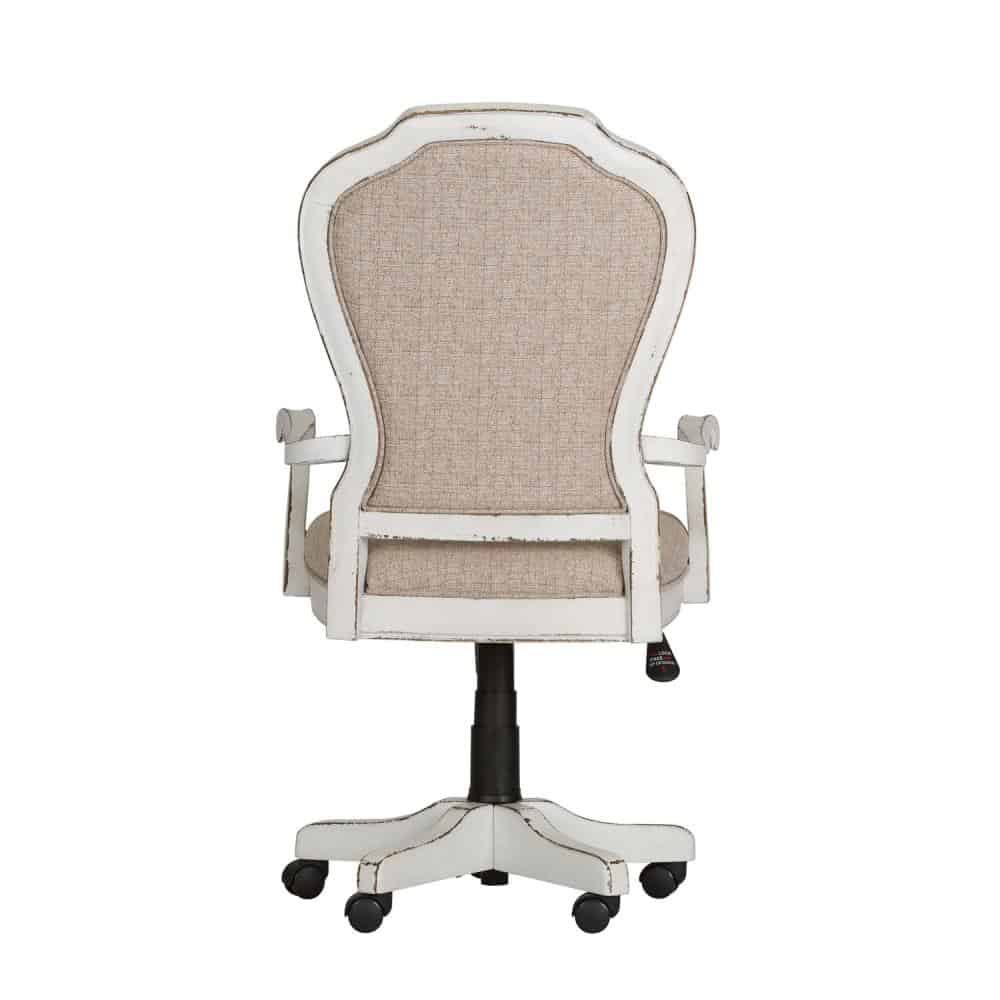 By Liberty Furniture. Sit in comfort with the Magnolia Manor Jr executive desk chair. Crafted of rubberwood solids, this piece features an adjustable seat height, dual wheel casters and is upholstered in ivory tufted chenille with white and brown threading throughout. Special Order.