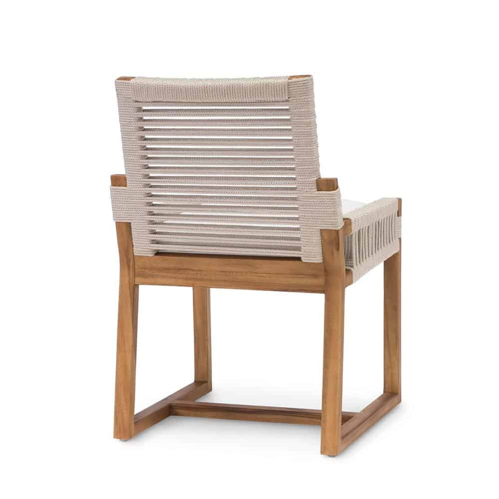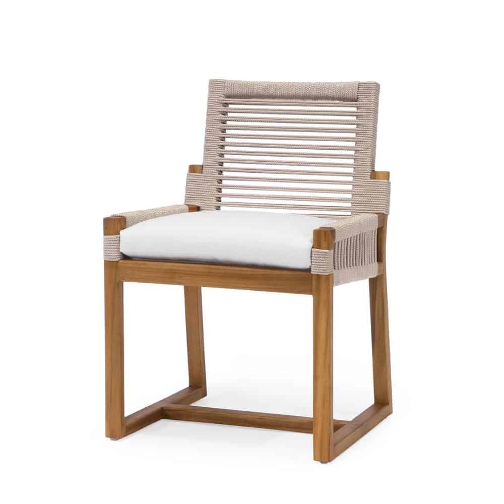 By Palecek. Teak wood frame and legs in natural golden brown finish. Double wall back and arms in taupe colored woven marine grade synthetic rope with maximum UV protection. Chair comes with a loose seat cushion. Coordinates with the San Martin outdoor collection. Natural teak wood is a golden brown color and over time, with exposure to the elements, it will gradually change to a silver gray patina which distinguishes finely aged outdoor teak. Available in your choice of fabric. Special Order.