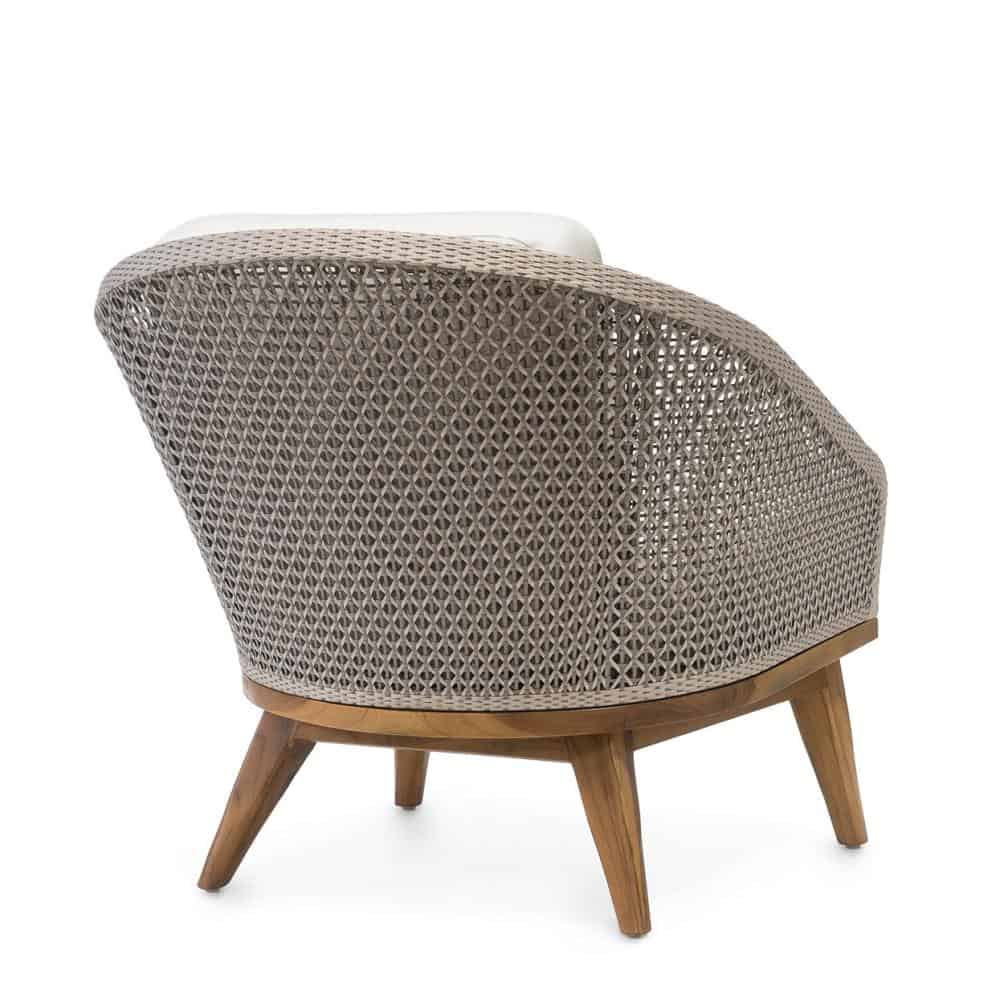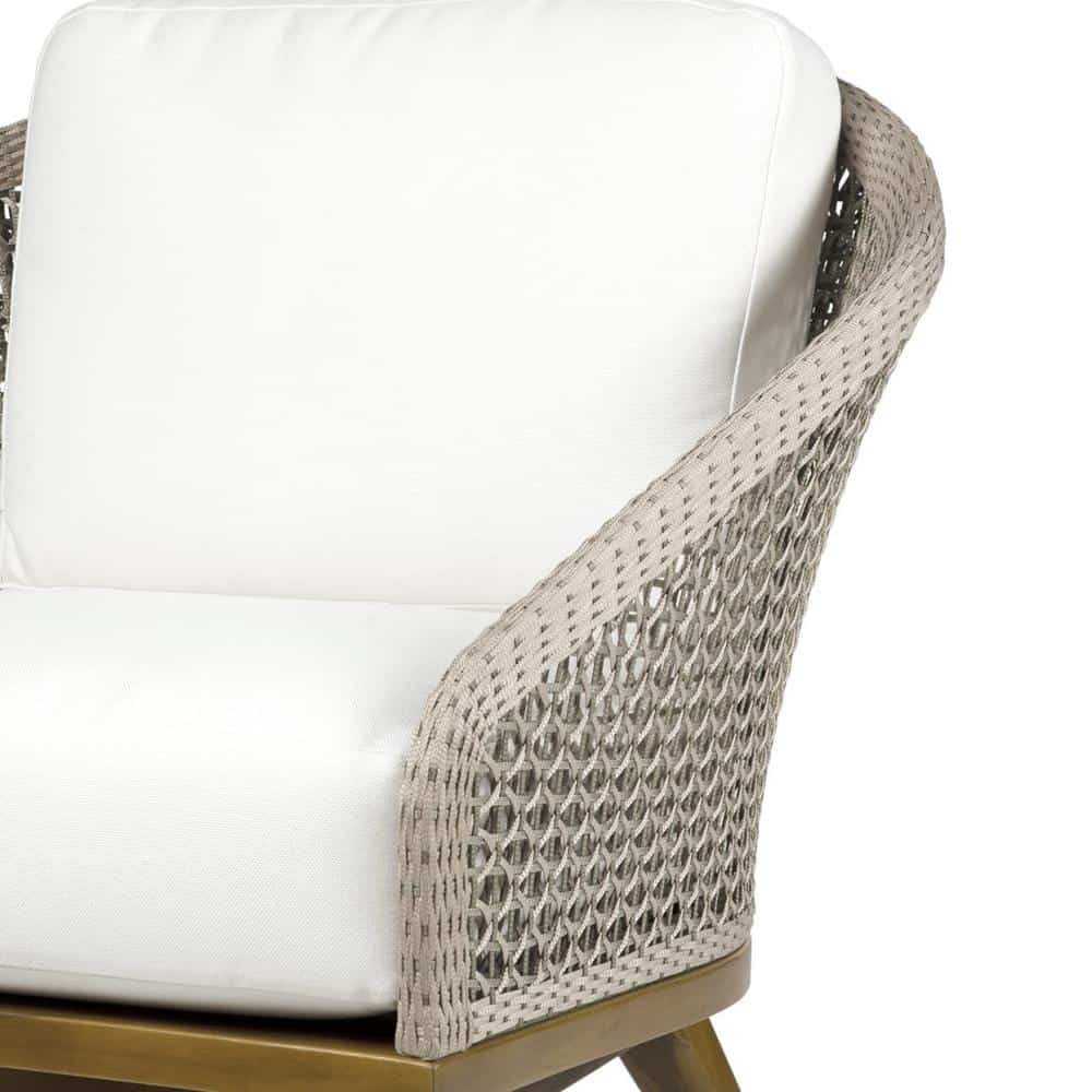 By Palecek. Teak wood frame and legs in a natural golden brown finish. Double wall back with woven marine grade synthetic rope in taupe and grey with maximum UV protection. Chair comes with a loose seat and back cushions. Natural teak wood is a golden brown color and over time, with exposure to the elements, it will gradually change to a silvery gray patina which distinguishes finely aged outdoor teak. Available in your choice of fabric. Special Order.