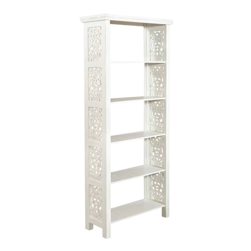 By Liberty Furniture. Accent your space with the one-of-a-kind Trellis Lane accent bookcase. Crafted of mango wood, this piece features a weathered white finish with brown rub thru, artisan hand carved end panels, five shelves of storage, anchored by block legs. This timeless bookcase will make a wonderful addition to your traditionally styled home. Add the accent writing desk and chair to complete your look. Special Order.